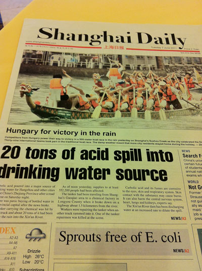 June 2011 was my first ever trip to Asia. I flew from Chicago (ORD) to Shanghai (PVG). Once I landed in Shanghai, we headed straight to the hotel where my associates went right to bed. It was about 4pm, so I decided to get some dinner and stay awake a couple more hours. I sat down at the hotel restaurant and they handed me this local paper. The cover was a great reminder not to drink the water.