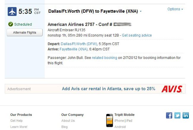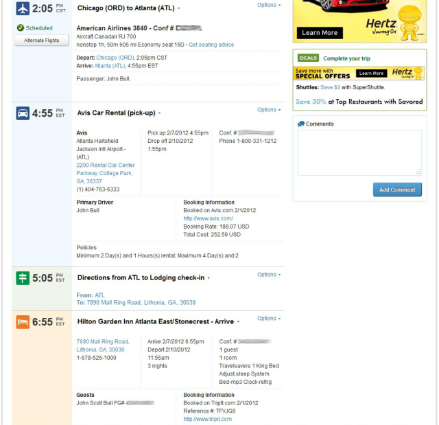 Heading back to TripIt, we see that the flight, hotel and rental car are all included in my itinerary, which has already synced with my app and my iCalendar feed, so it’s also in Outlook.