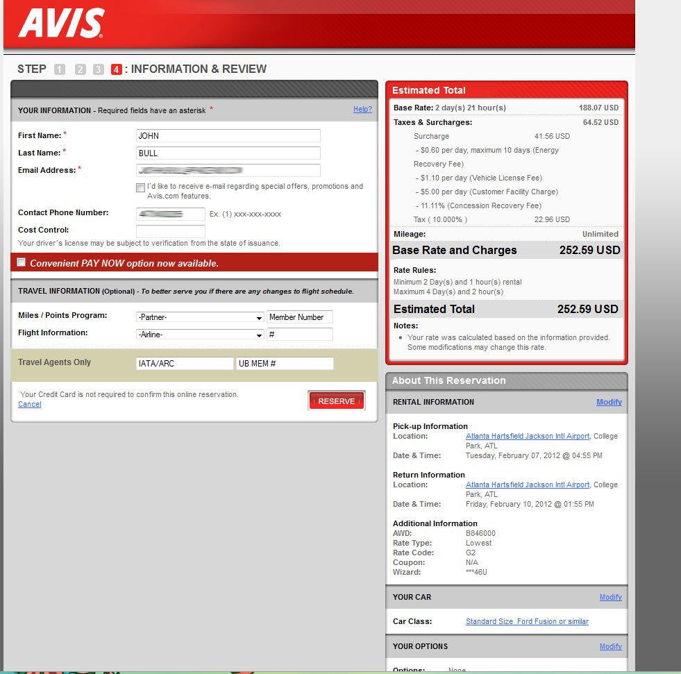 Step 7: At the bottom of the itinerary, there’s an “Advertisement” from Avis. When it is clicked, it not only takes you to the Avis reservation website, but it also transfers your trip information to complete most of the work on the Avis site for you.