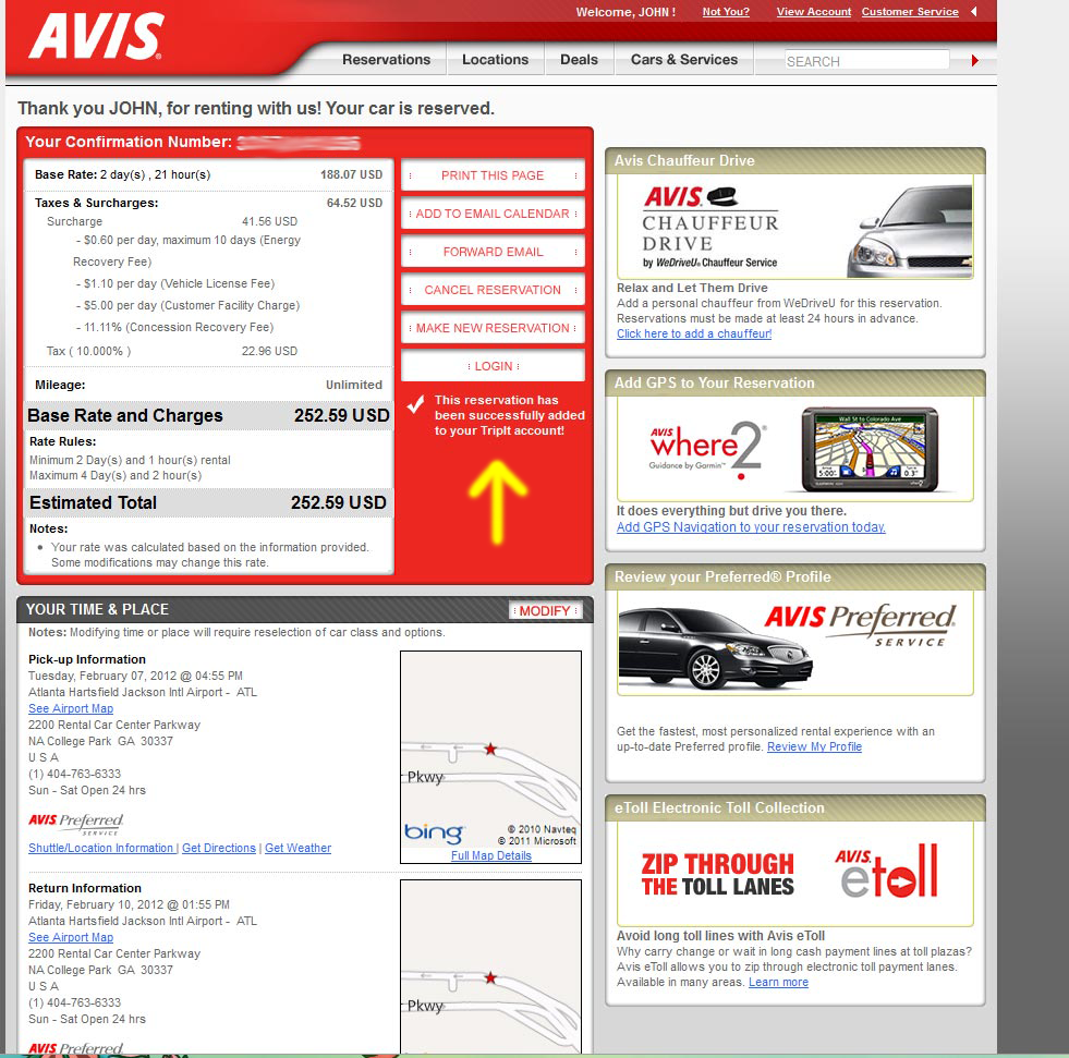 Step 11: Here’s the confirmation from Avis. Notice the text where the yellow arrow is: “This reservation has been successfully added to your TripIt account!”