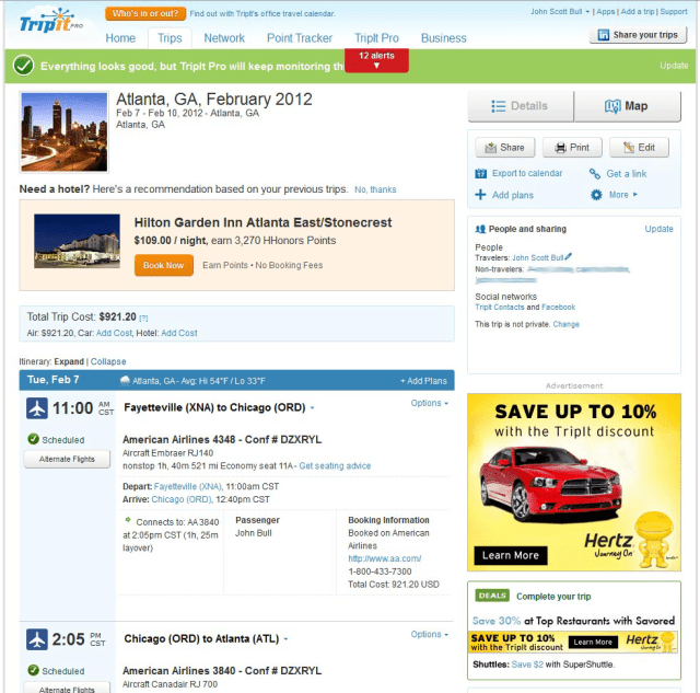 For those unfamiliar with TripIt, it is a free service that provides one simple function, then adds a lot of bells and whistles to it. My initial attraction to TripIt is that I can book a flight/hotel/car/etc. with anyone I wish. I then take the confirmation e-mail for the booking, forward it to plans@tripit.com and TripIt will build a beautiful, private, organized itinerary that is viewable online or in their app. That is, in itself, a huge value, but here are some additional features that push TripIt over the top and make it my absolute favorite travel tool.